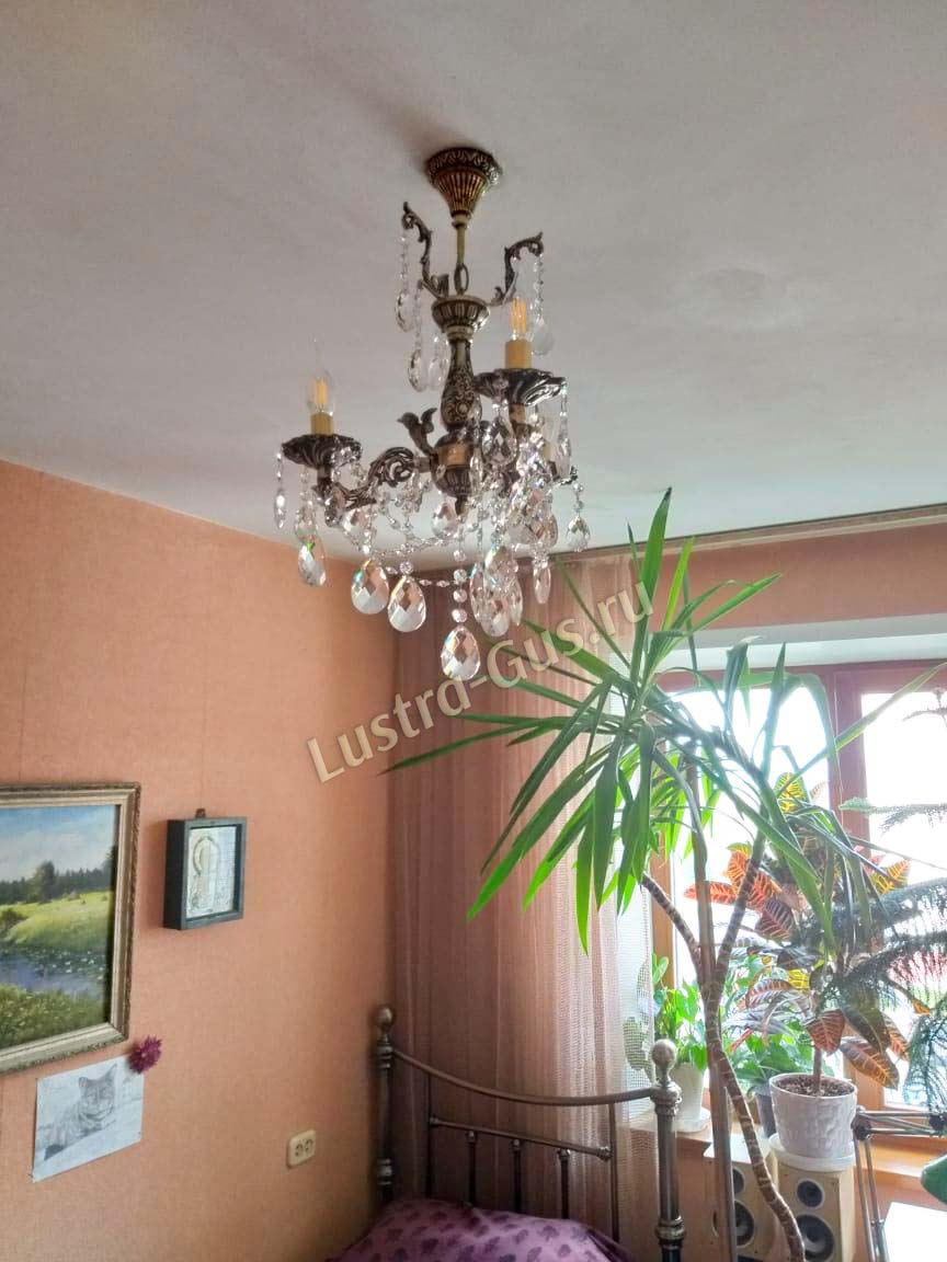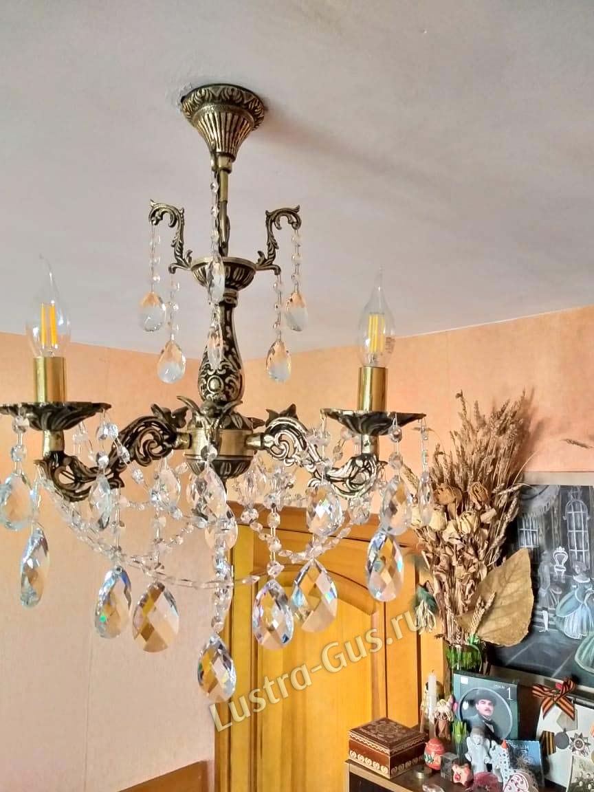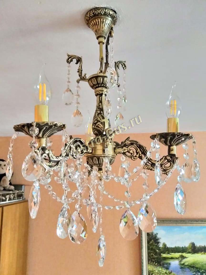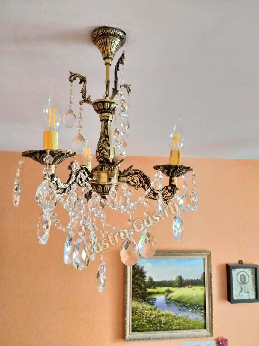 Бронзовая хрустальная люстра превзошла мои ожидания по красоте и качеству. Бронза с чернением, сверкающий хрусталь, нежная, изысканная, притягивает взгляд. В комнате 10 кв. м и 2,7 высотой люстра с тремя рожками хорошо освещает и подходит по размерам. Спасибо!